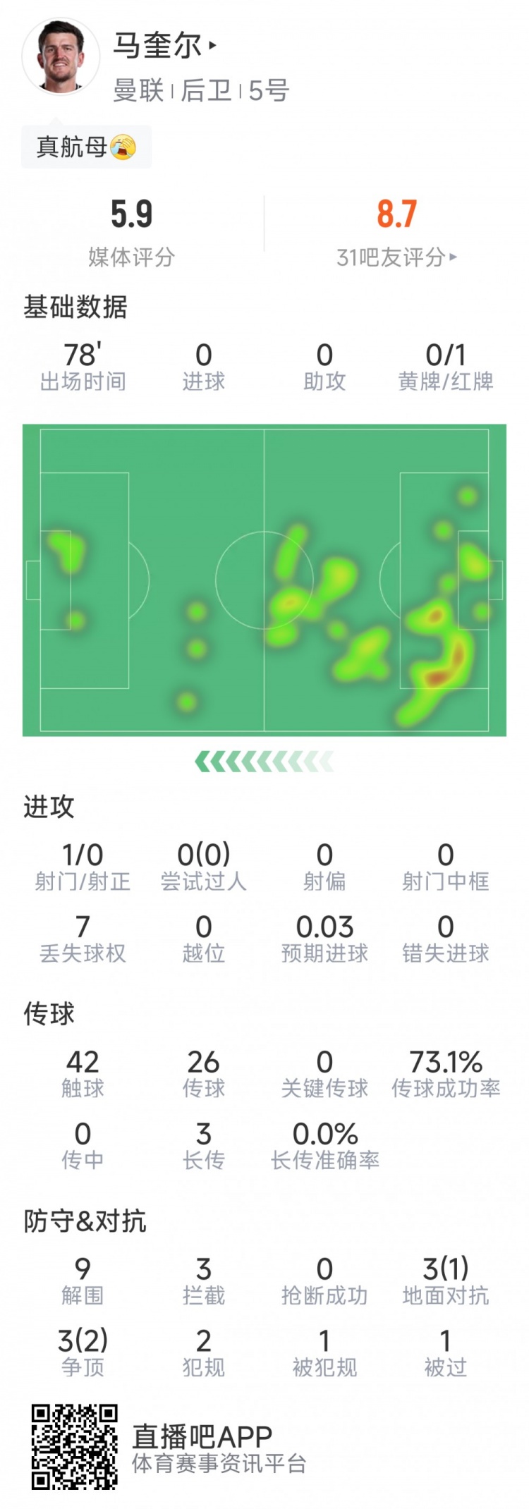 JRS直播吧3月21日讯 在本轮英超曼联对伯恩茅斯比赛中,马奎尔送点+染红,以下为他在本场数据: